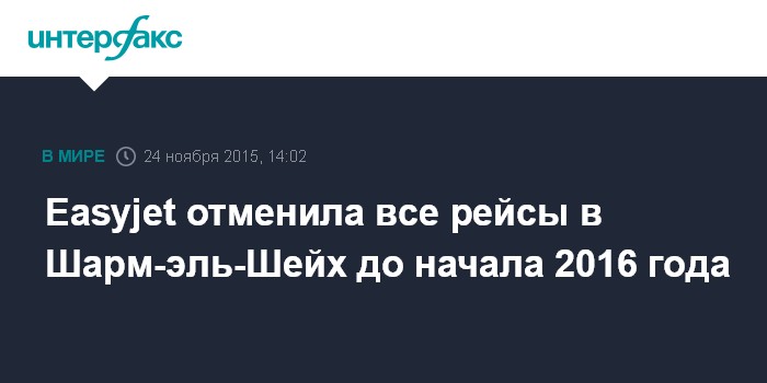 Москва. 24 ноября. INTERFAX.RU - Британская авиакомпания Easyjet приняла решение приостановить все перелеты между аэропортами Великобритании и Шарм-эль-Шейхом до января 2016 года, сообщает во вторник "Би-би-си".