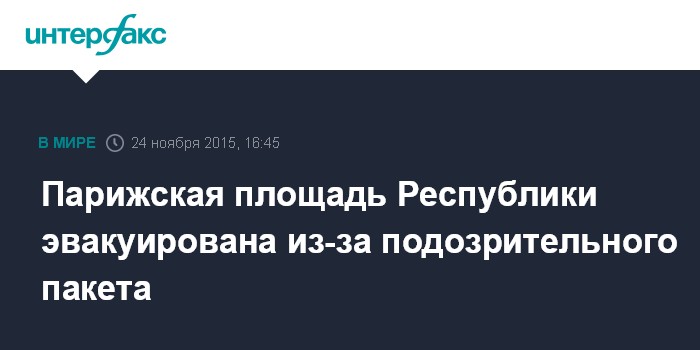 Москва. 24 ноября. INTERFAX.RU - Полиция Парижа эвакуировала людей с площади Республики и одноименной станции метро из-за подозрительного пакета, сообщает во вторник радиостанция Europe 1 .