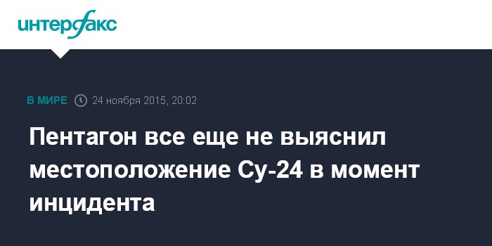 Москва. 24 ноября. INTERFAX.RU - Пентагон все еще выясняет местоположение российского боевого самолета Су-24 в момент, когда по нему открыли огонь турецкие военные, заявил представитель Минобороны США Стив Уоррен.