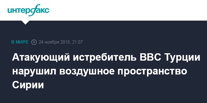 Москва. 24 ноября. INTERFAX.RU - В Минобороны России заявляют, что турецкая сторона перед тем, как сбить Су-24, не пыталась установить контакт с экипажем российского самолета, а атакующий истребитель ВВС Турции нарушил воздушное пространство Сирии.