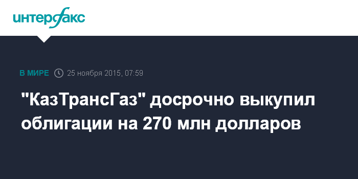 Москва. 25 ноября. INTERFAX.RU - "КазТрансГаз" (КТГ) досрочно выкупил облигации на 270 млн долларов, выпущенные в 2007 году со сроком обращения до 2017 года включительно, сообщила пресс-служба компании.