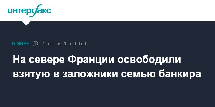 Москва. 25 ноября. INTERFAX.RU - Французская полиция освободила семью менеджера банка, которая накануне вечером была взята в заложники в городе Рубе на севере Франции, сообщают в среду местные СМИ.