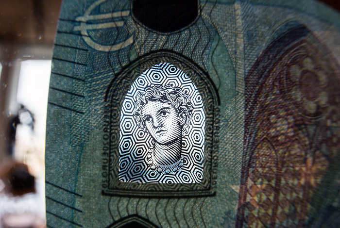Для защиты от подделки на купюре появилось специальное "окошко", в котором на просвет проявляется портрет мифологического персонажа Европы
