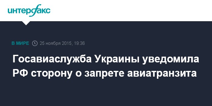 Москва. 25 ноября. INTERFAX.RU - Государственная авиационная служба Украины во исполнение решения правительства направила письма в Росавиацию и МИД Украины, которыми уведомила: транзит для всех самолетов Российской Федерации через воздушное пространство Украины прекращается с 00.00 26 ноября, сообщило Министерство инфраструктуры в фэйсбуке.