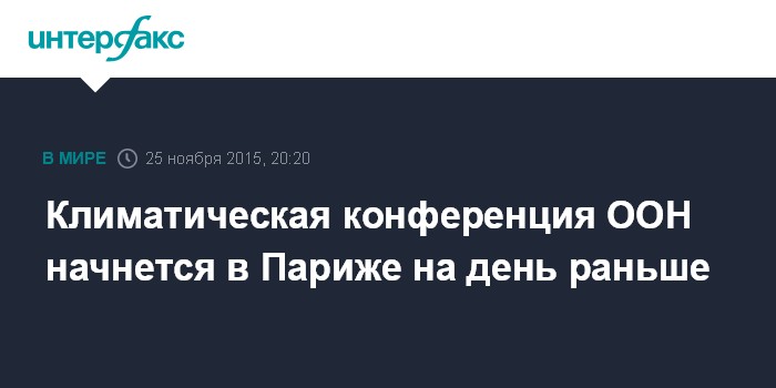 Москва. 25 ноября. INTERFAX.RU - Открытие всемирной климатической конференции ООН COP21 в Париже перенесено на день раньше, сообщает в среду газета Le Figaro со ссылкой на заявление ООН.