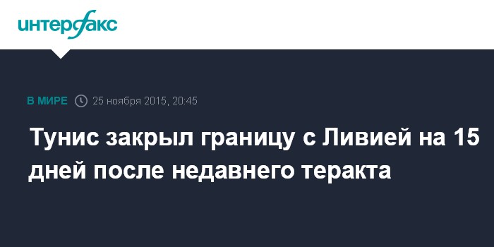 Москва. 25 ноября. INTERFAX.RU - Власти Туниса объявили о закрытии границы с Ливией после нападения террориста-смертника на сотрудников охраны главы государства, сообщают в среду французские СМИ со ссылкой на коммюнике президентской администрации.