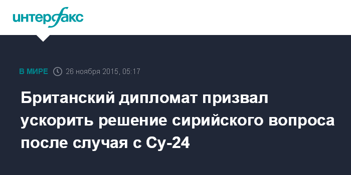 Москва. 26 ноября. INTERFAX.RU - Гибель российского бомбардировщика Су-24, сбитого турецкими ВВС в Сирии, свидетельствует о необходимости ускорения процесса урегулирования сирийского конфликта, считает постпред Великобритании при ООН Мэтью Райкрофт.