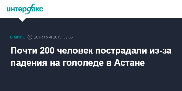 Москва. 26 ноября. INTERFAX.RU - Менее чем за сутки в Астане в результате гололеда пострадали 182 человека, 13 госпитализированы, сообщили агентству "Интерфакс" в управлении здравоохранения Астаны.