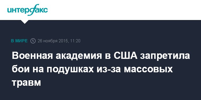 Москва. 26 ноября. INTERFAX.RU - Руководство военной академии США Вест-Пойнт решило запретить неофициальные бои подушками между кадетами, сообщает британское издание The Daily Mail со ссылкой на главу академии генерал-лейтенанта Роберта Каслена.