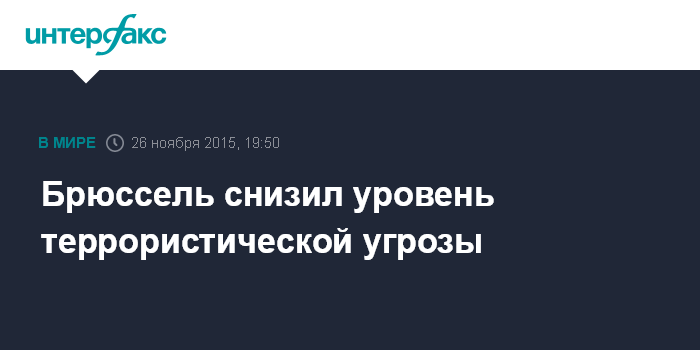 Москва. 26 ноября. INTERFAX.RU - Премьер-министр Бельгии Шарль Мишель объявил в четверг вечером решение Национального совета безопасности снизить в Брюссельском регионе оценку террористической угрозы с высшей, четвертой, до третьей по четырехбалльной шкале.