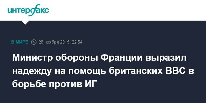 Москва. 26 ноября. INTERFAX.RU - Министр обороны Франции Жан-Ив Ле Дриан призвал в четверг британские власти направить свои ВВС для участия в операциях против ИГ в Сирии.