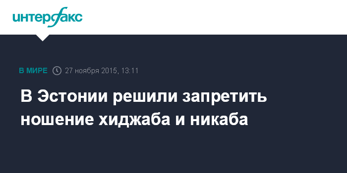 Москва. 27 ноября. INTERFAX.RU - Министерство юстиции Эстонии направило на рассмотрение другим министерствам и ведомствам законопроект, запрещающий женщинам ношение хиджаба и никаба в общественных местах, в первую очередь, в государственных, образовательных и медицинских учреждениях.