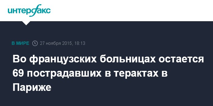 Москва. 27 ноября. INTERFAX.RU - В больницах Франции, по состоянию на пятницу, остаются 69 человек, получивших ранения во время терактов в Париже, сообщает сайт газеты Le Figaro.