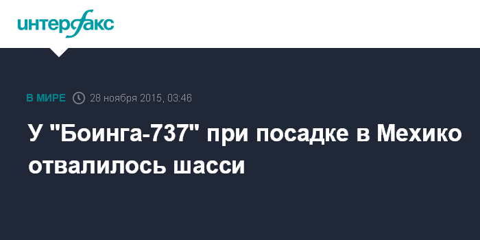 Москва. 28 ноября. INTERFAX.RU - "Боинг-737" совершил жесткую посадку в аэропорту Мехико. При посадке у него подогнулась левая стойка шасси, сообщает The Guardian.
