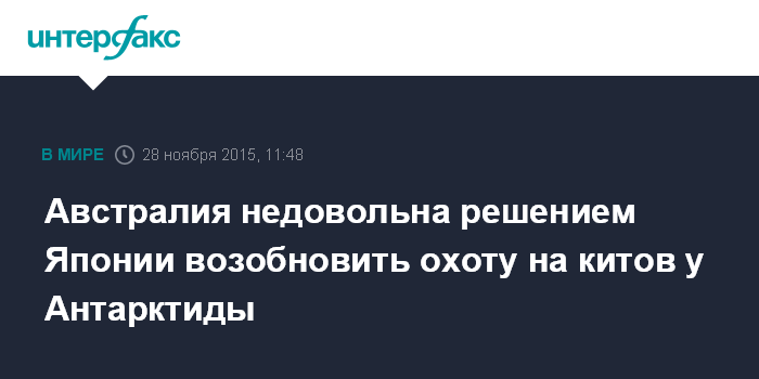 Москва. 28 ноября. INTERFAX.RU - Министр окружающей среды Австралии Грег Хант подверг критике намерения властей Японии вновь начать ловлю китов в водах, окружающих Антарктиду, пишет в субботу газета The Australian.