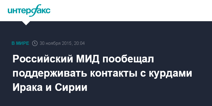 Москва. 30 ноября. INTERFAX.RU - Москва и дальше будет поддерживать контакты с курдами в Ираке и в Сирии, заявил спецпредставитель президента РФ по Ближнему Востоку и Северу Африки, замглавы МИД РФ Михаил Богданов.