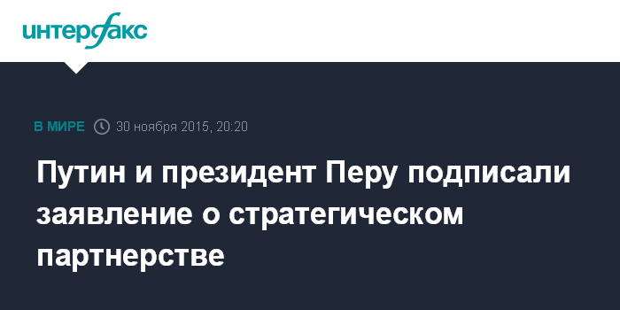 Москва. 30 ноября. INTERFAX.RU - Президенты РФ и Перу Владимир Путин и Ольянта Умала в Париже "на полях" конференции по климату провели переговоры и подписали заявление о стратегическом партнерстве.