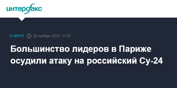 "Что касается сбитого российского самолета, то, конечно, эта тема звучала практически во всех моих двусторонних встречах. Я давал соответствующие пояснения и рассказывал о том, что произошло. Насколько я себе представляю, то есть не представляю, а видел, все коллеги внимательно слушали, и подавляющее большинство разделяют тот тезис, согласно которому не было никакой необходимости наносить удар по незащищенному российскому бомбардировщику, который Турции не угрожал", - сказал Путин журналистам по итогам своего участия в климатическом саммите во Франции.
