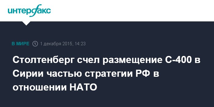 Москва. 1 декабря. INTERFAX.RU - Решение России разместить в Сирии ЗРС С-400 укладывается в общую стратегию Москвы, предусматривающую развертывание современного вооружения вблизи зон соприкосновения с НАТО, заявил генсек альянса Йенс Столтенберг.