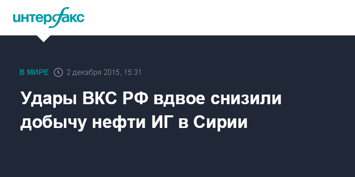 Москва. 2 декабря. INTERFAX.RU - В результате ударов российской авиации доходы ИГ от незаконно добываемой нефти сократились на 50% - с 3 млн долларов до 1,5 млн долларов, заявил заместитель начальника Генштаба РФ Сергей Рудской.
