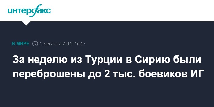 Москва. 2 декабря. INTERFAX.RU - За неделю с территории Турции в отряды ИГИЛ ("Исламское государство") и "Джабхат ан-Нусра" (обе группировки запрещены в России - ИФ) переброшены до 2 тыс. боевиков и 120 тонн боеприпасов, заявил глава Национального центра управления обороны РФ Сергей Мизинцев.