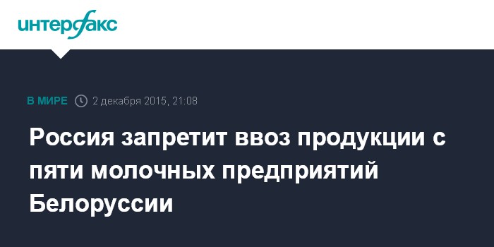 Москва. 2 декабря. INTERFAX.RU - Россельхознадзор, как и обещал, с 7 декабря вводит запрет на поставки продукции с пяти молочных предприятий Белоруссии.