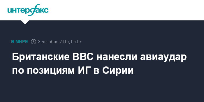 Москва. 3 декабря. INTERFAX.RU - Четыре самолета "Торнадо" ВВС Великобритании нанесли авиаудар по позициям боевиков "Исламского государства" (ИГ) на территории Сирии, сообщает агентство Ассошиэйтед пресс (АП) со ссылкой на источник в Минобороны Великобритании.