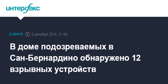 Москва. 3 декабря. INTERFAX.RU - В доме людей, подозреваемых в организации стрельбы в доме для инвалидов в Сан-Бернардино (штат Калифорния, США), обнаружено 12 самодельных взрывных устройств, сообщили в четверг на пресс-конференции представители местной полиции.