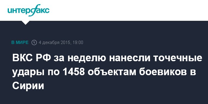 Москва. 4 декабря. INTERFAX.RU - За прошедшую неделю с 26 ноября по 4 декабря российская авиация выполнила 431 боевой вылет с авиабазы Хмеймим и нанесла точечные удары по 1458 объектам террористов в провинциях Алеппо, Идлиб, Латакия, Хама, Хомс, Дейр-эз-Зор и Ракка, сообщил журналистам официальный представитель Минобороны РФ генерал-майор Игорь Конашенков.