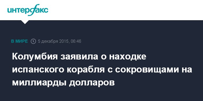 Москва. 5 декабря. INTERFAX.RU - Колумбийские власти сообщили, что обнаружили затонувшие обломки старинного испанского корабля, на котором предположительно находятся сокровища, стоимость которых по нынешним временам может достигать миллиардов долларов.
