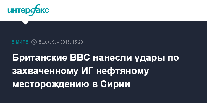 Москва. 5 декабря. INTERFAX.RU - Самолеты британских ВВС в субботу нанесли удары по нефтяному месторождению Омар в Сирии, находящемуся под контролем исламских радикалов, сообщает британская телерадиокорпорация "Би-би-си".