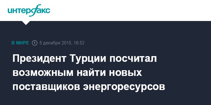 Москва. 5 декабря. INTERFAX.RU - Турция намерена найти других поставщиков энергоресурсов в связи с нынешней ситуацией в отношениях с Россией, заявил в субботу президент страны Реджеп Тайип Эрдоган.
