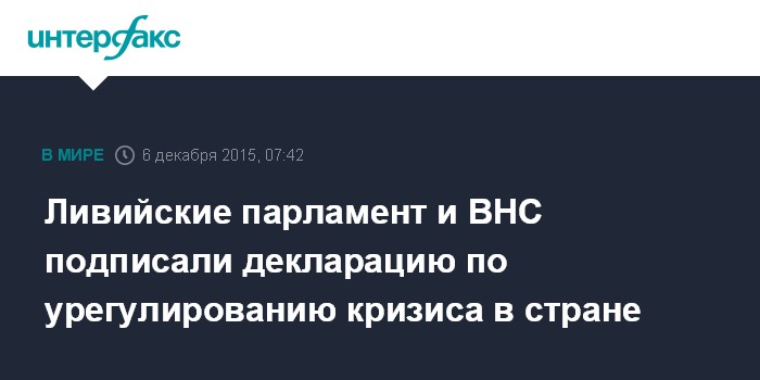 Москва. 6 декабря. INTERFAX.RU - Парламент и Всеобщий национальный конгресс (ВНС) Ливии - две противоборствующие структуры - подписали декларацию о преодолении внутриполитического кризиса в стране, сообщили в воскресенье СМИ.