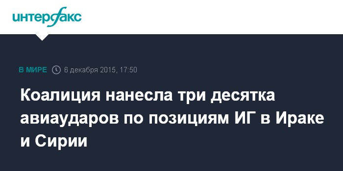 Москва. 6 декабря. INTERFAX.RU - ВВС стран международной коалиции, действующей под руководством США, нанесли 29 авиаударов по позициям "Исламского государства" (запрещенная в России организация - ИФ) в Ираке и Сирии, сообщили СМИ со ссылками на объединенное командование.