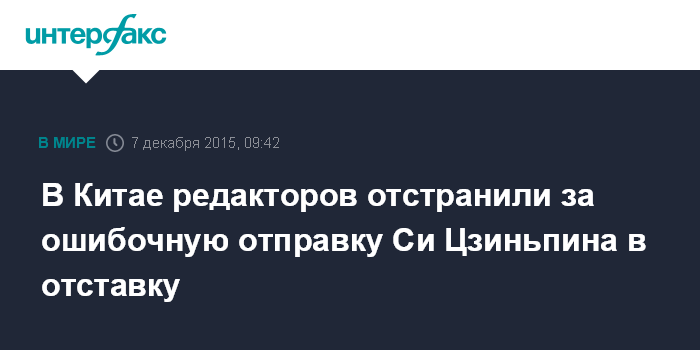 Москва. 7 декабря. INTERFAX.RU - Четыре редактора китайского новостного агентства China News Service были отстранены от работы после ошибки, допущенной в материале, посвященном выступлению председателя КНР Си Цзиньпина в Йоханнесбурге, сообщает South China Morning Post.