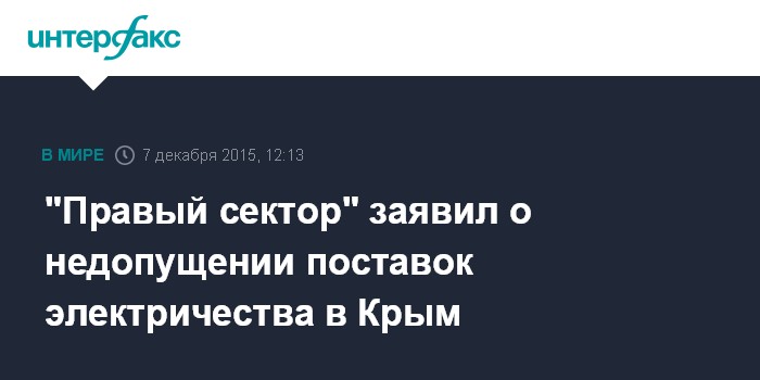 Москва. 7 декабря. INTERFAX.RU - В движении "Правый сектор" (экстремистская организация, запрещенная в России) заявили, что минувшей ночью не позволили энергетикам восстановить подачу электроэнергии по одной из линий электропередач, ведущих в Крым.