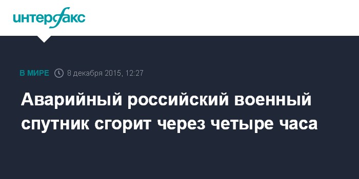 Аварийный российский военный спутник сгорит через четыре часа