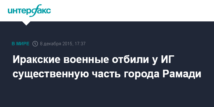 Москва. 8 декабря. INTERFAX.RU - Иракские военнослужащие освободили от боевиков террористической группировки "Исламское государство" (запрещена в РФ) значительную часть города Рамади, сообщают во вторник европейские СМИ со ссылкой на иракских официальных лиц.