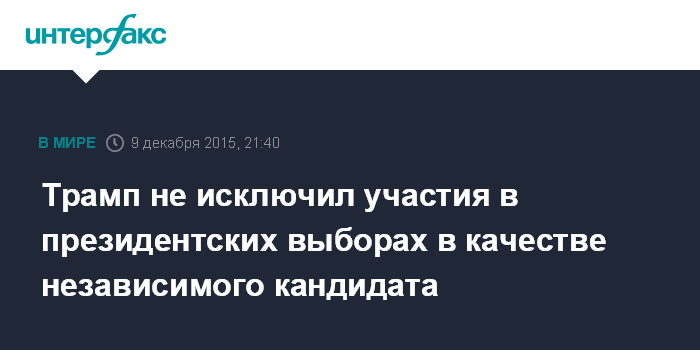 Москва. 9 декабря. INTERFAX.RU - Один из претендентов на пост президента США Дональд Трамп заявил в среду, что не исключает участия в выборах в качестве независимого кандидата, сообщает агентство EFE.