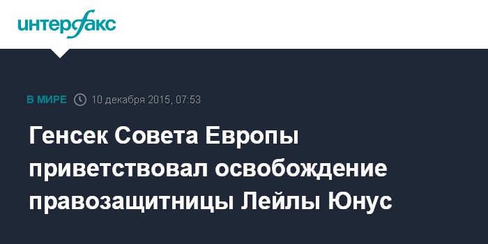 Москва. 10 декабря. INTERFAX.RU - Генеральный секретарь Совета Европы Турбьерн Ягланд приветствовал освобождение азербайджанского правозащитника Лейлы Юнус.