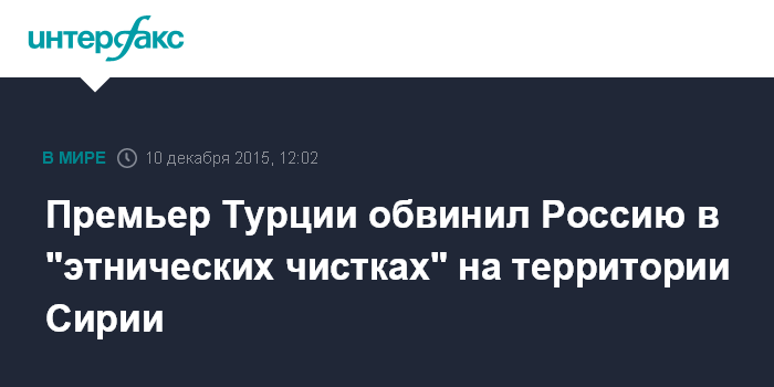 Москва. 10 декабря. INTERFAX.RU - Премьер-министр Турции Ахмет Давутоглу выступил с обвинениями в адрес России по поводу ее действий на севере сирийской территории.