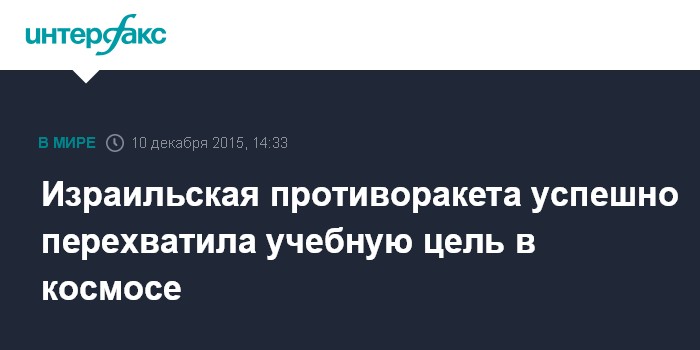 Москва. 10 декабря. INTERFAX.RU - Министерство обороны Израиля совместно с Агентством ПРО США в четверг провели успешное испытание новейшей системы противоракетной обороны Arrow 3, перехватив противоракетой учебную баллистическую цель в космосе, сообщило оборонное ведомство страны.