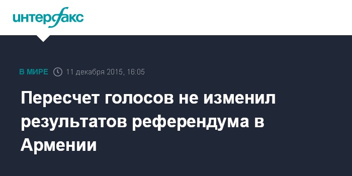 Референдум, предполагающий переход Армении на парламентскую форму правления с президентской, прошел в республике 6 декабря. По данным ЦИК, за конституционные изменения проголосовали 63,35% избирателей (825 тыс. 851 человек), против - 32,35% (421 тыс. 600 человек). Явка составила 50,51%.