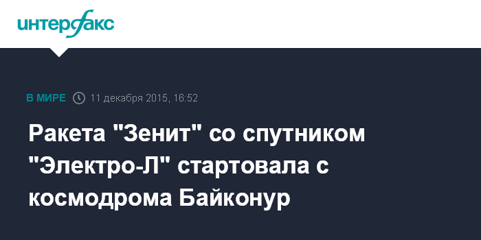 Москва. 11 декабря. INTERFAX.RU - Российско-украинская ракета "Зенит-2SБ" с российским спутником дистанционного зондирования Земли "Электро-Л" №2 на борту стартовала с космодрома Байконур, заявили "Интерфаксу-АВН" в Роскосмосе в пятницу.