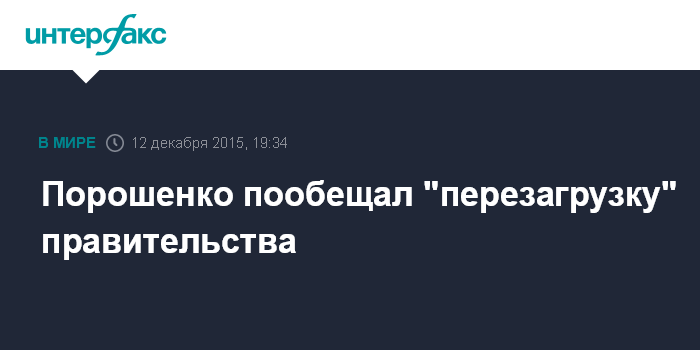 Москва. 12 декабря. INTERFAX.RU - Президент Украины Петр Порошенко уверен в перезагрузке правительства и считает, что представители партии "Блок Петра Порошенко "Солидарность" должны занять места в кабинете министров.