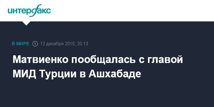 Москва. 12 декабря. INTERFAX.RU - Спикер Совета Федерации Валентина Матвиенко и глава МИД Турции Мевлют Чавушоглу пообщались в кулуарах международной конференции в Ашхабаде по инициативе турецкой стороны.