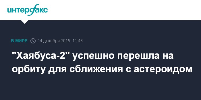 Москва. 14 декабря. INTERFAX.RU - Космический аппарат "Хаябуса-2" успешно выполнил околоземный маневр по ускорению и перешел на новую орбиту для сближения с астероидом Рюгу, сообщает сайт N+1 со ссылкой на Японское Агентство Аэрокосмических исследований JAXA.