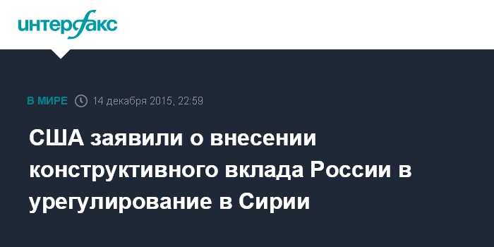 Москва. 14 декабря. INTERFAX.RU - США считают, что Россия внесла конструктивный вклад в дипломатическое урегулирование ситуации в Сирии, заявил в понедельник представитель Белого дома Джош Эрнест.