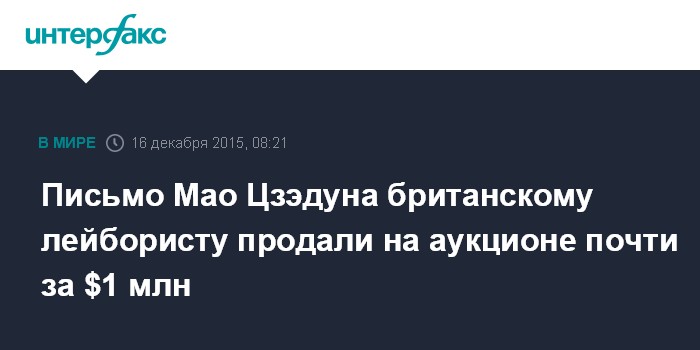 Москва. 16 декабря. INTERFAX.RU - За 600 тысяч фунтов-стерлингов ($902, 85 тысяч) было продано письмо основателя КНР Мао Цзэдуна лидеру британских лейбористов Клементу Эттли на аукционе "Сотбис" в Лондоне, сообщили СМИ с места события.