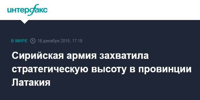 Москва. 16 декабря. INTERFAX.RU - Армия Сирии установила контроль над горой ан-Нуба, которая занимает стратегически важное положение в провинции Латакия, сообщает сирийское государственное телевидение.